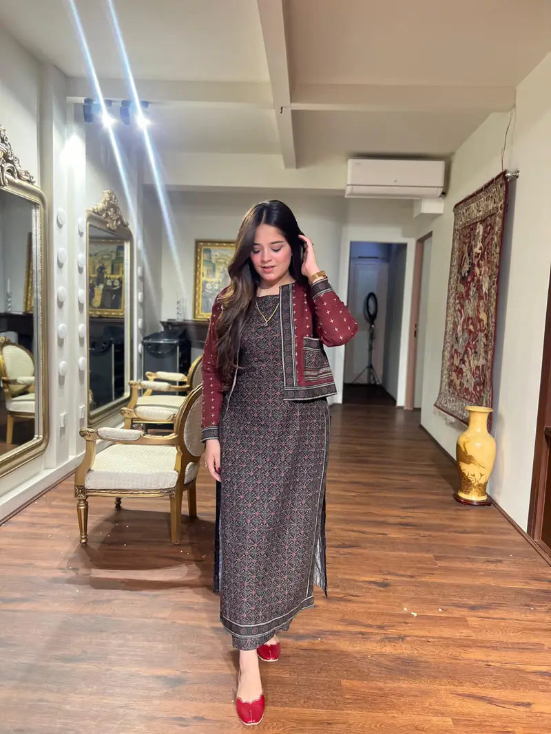 Regal and exquisitely detailed, the Mehrunisa 3PC is crafted from fluid Crepe fabric and features a matching structured jacket for a polished, layered look. This ensemble blends traditional artistry with modern elegance, making it a distinguished choice for formal ceremonies, cultural events, and grand festive occasions.